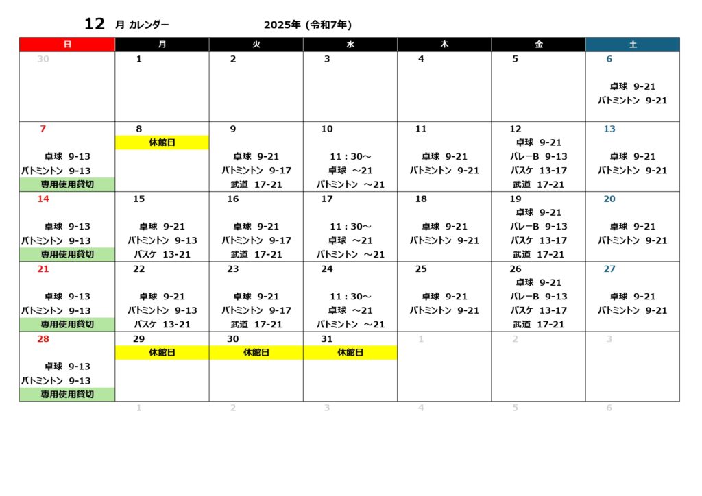 ご利用可能種目のスケジュール詳細は下記のカレンダーをご確認ください。