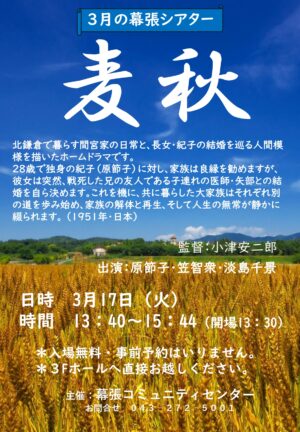 「幕張シアター」は、毎月第3火曜日、幕張コミュニティセンター3F「ホール」にて13:40より上映しております。懐かしい昔の映画が無料で鑑賞いただけます。 今回の映画は、北鎌倉で暮らす間宮家の日常と、長女・紀子の結婚を巡る […]