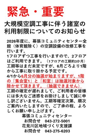 - 緊急・重要 大規模空調工事に伴う諸室の利用制限についてのお知らせ2026年度に、幕張コミュニティセンター全館(体育館除く)の空調設備の改修工事を行います。 1フロアずつ工事を行いますので、2フロアはご利用できます。(1フロアの工期約3か月) 工期等はまだ未定ですが、6月ごろより1階か […]