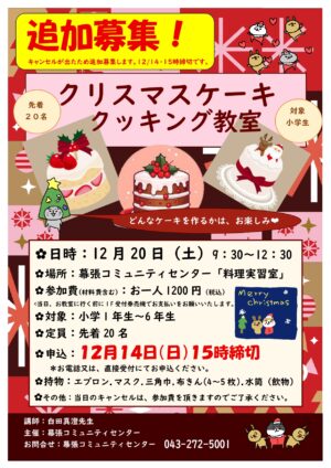 【追加募集!!】12月20日(土)クリスマスケーキクッキング教室New!!