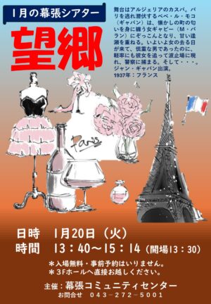 「幕張シアター」は、毎月第3火曜日、幕張コミュニティセンター3F「ホール」にて13:40より上映しております。懐かしい昔の映画が無料で鑑賞いただけます。 今回の映画の舞台はアルジェリアのカスバ。パリを逃れ潜伏するペペ・ル […]