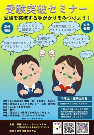 千葉大生をはじめとした現役大学生が体験談や勉強法をお話しします。座談会もありますので、不安や疑問を解消して、受験を突破する手がかりを見つけましょう!・おすすめの勉強法は?・勉強に集中できない!どうしたらいいの?・授業や塾 […]