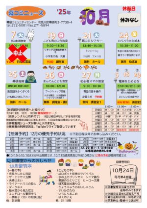 幕張コミュニティセンターでは、月に1回、「幕コミニュース」を作成しております。各種イベント案内、図書室での10月新刊、諸室の優先予約状況(2か月先)、体育館の使用状況など情報が盛りだくさん。ロビーに掲示、配布しております […]