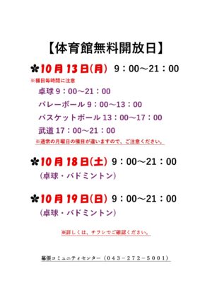 明日(10/13・スポーツの日)は、体育館を無料開放します!10/18(土)、10/19(日)も!!!新着!!