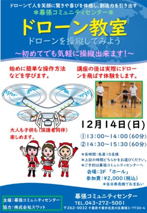 大人も子供も(小学生低学年は保護者様同伴をお願いします)楽しめます。実際にドローンを操縦してみましょう!ご予約は幕張コミュニティセンターへ 参加費用は¥2000です♪