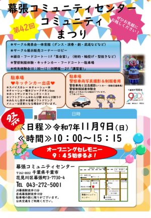 幕張コミュニティセンター コミュニティまつりは、体育館では、ダンス、生演奏、演劇、武道、などなど、ロビーや1階では、作品展示・販売、風船配布、縁日(射的、ヨーヨー釣り、型抜き、輪投げ)、くじ引きなどなど、2階では吹き矢の […]