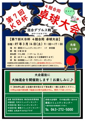 令和8年3月14日(土)「第7回KB杯4館合同卓球大会」開催決定!!新着!!