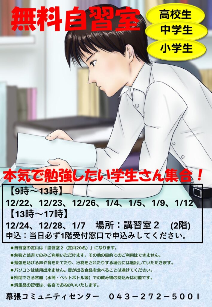 冬休みにゆったり、じっくり勉強してみませんか?予約不要、先着制、定員20名。