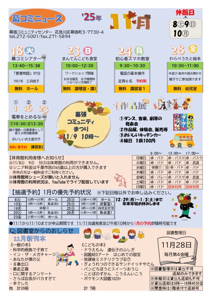 11月の幕コミニュース! 2025年11月1日 最終更新日時 : 2025年11月1日 幕張コミュニティセンター 未開催 幕張コミュニティセンターでは、月に1回、「幕コミニュース」を作成しております。各種イベント案内、図書室での11月新刊、諸室の優先予約状況(2か月先)、体育館の使用状況など情報が盛りだくさん。ロビーに掲示、配布しております!!