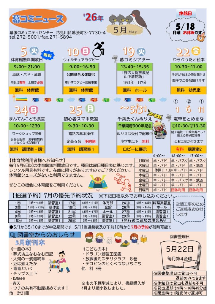 5月の幕コミニュース! 2026年4月28日 最終更新日時 : 2026年4月28日 幕張コミュニティセンター 未開催 幕張コミュニティセンターでは、月に1回、「幕コミニュース」を作成しております。各種イベント案内、図書室での5月新刊、諸室の優先予約状況(2か月先)、体育館の使用状況など情報が盛りだくさん。ロビーに掲示、配布しております!!