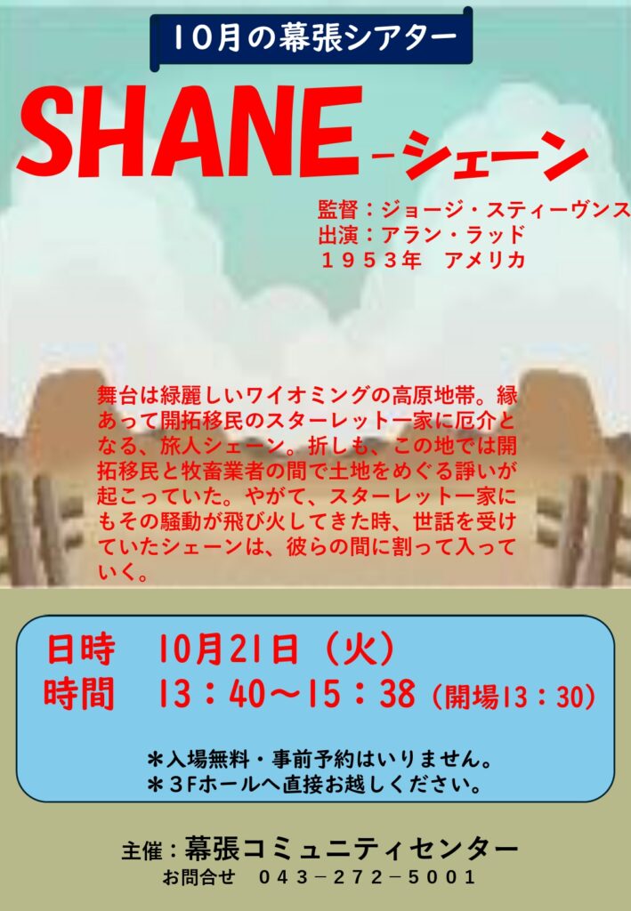 10/21(火)の幕張シアターは、「Shane!Come back!(シェーン!カムバック!)」で有名な名作「Shane(シェーン)」を上映します!