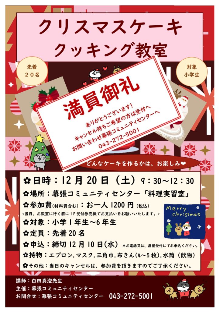【満員御礼】12月20日(土)クリスマスケーキクッキング教室 2025年10月16日 最終更新日時 : 2025年10月16日 幕張コミュニティセンター 未開催 大人気の教室、クリスマスケーキをつくります。どんなケーキをつくるかはお楽しみ。対象は小学生です。今回は、キャンセル待ちになりました。よろしくお願いいたします。