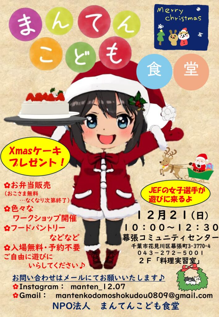 12月の「まんてん子ども食堂」は、クリスマスケーキ・プレゼント、JEF女子選手も遊びに来てくれます!