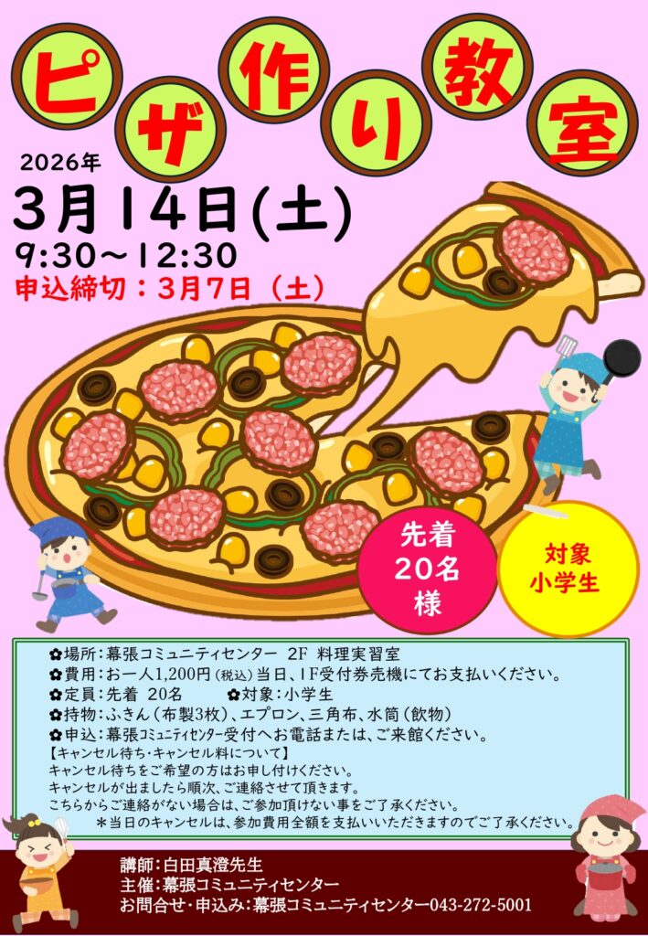 大人気の教室、今回はピザをつくります。どんなピザをつくるかはお楽しみ。対象は小学生です。