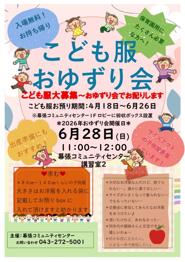 子供さんの成長で切れなくなった服、誰かに着てほしい服、を募集しています。4月18日~6月26日までお預りボックスをロビーに設置します。たくさんのこども服お待ちしています。