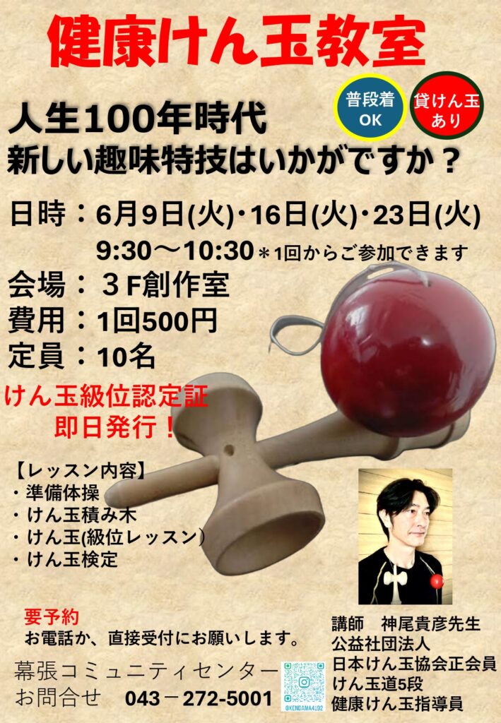 6/9(火)、6/16(火)、6/23(火) 健康けん玉教室開催!   人生100年時代 新しい趣味・特技はいかがですか?