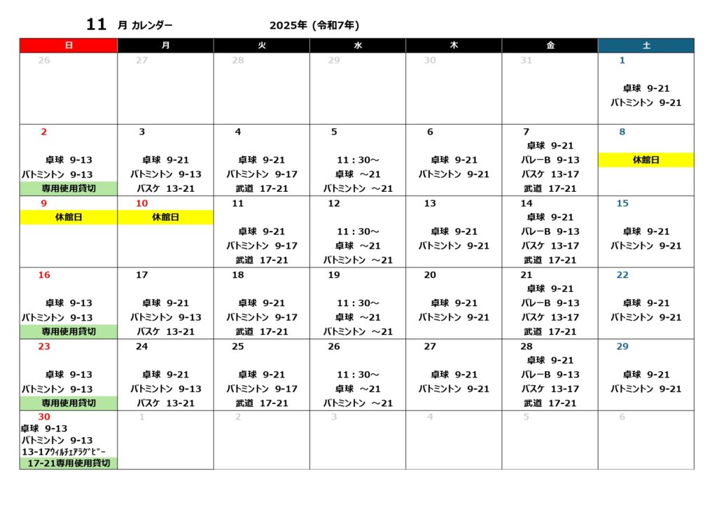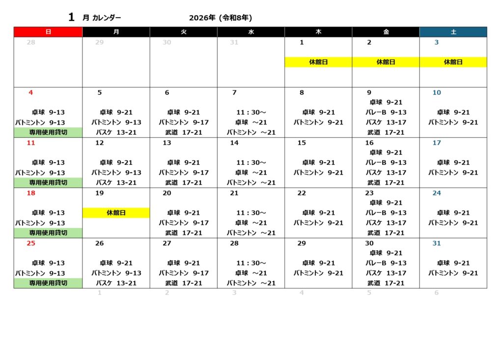 | 日曜 | 卓球 バドミントン | 専用使用 (卓球・バドミントン) | 専用使用 (卓球・バドミントン) |