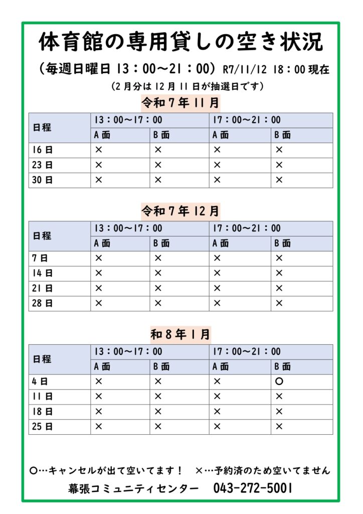※日曜日の専用使用の時間枠に予約がない場合は、卓球・バドミントンの個人利用となります。